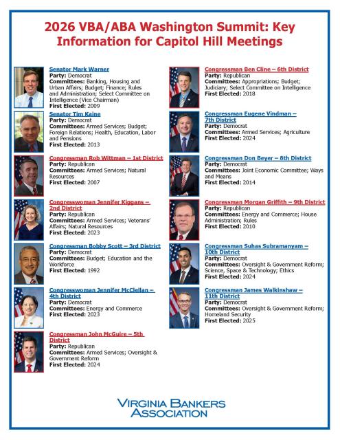 Don’t be afraid to participate in the conversation! The VBA will designate a banker to help guide the discussion with the members, but there will be time for your comments and questions as well. When commenting, introduce yourself, your bank and what you do. Let them know where in the district you live to remind the member you are a constituent. Leave the member with a clear impression of the action you want taken. Stay positive even if you do not receive the answer you want. Do not be afraid to say you don’t know if asked a question you cannot answer.