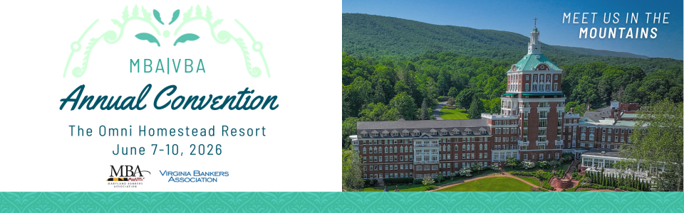To be held on June 7-10, the 2026 MBA|VBA Annual Convention will take place at The Omni Homestead Resort in Hot Springs, VA. The 2026 event will combine a great lineup of speakers on timely topics and networking with bankers and industry providers.