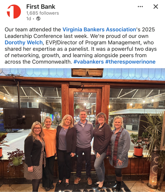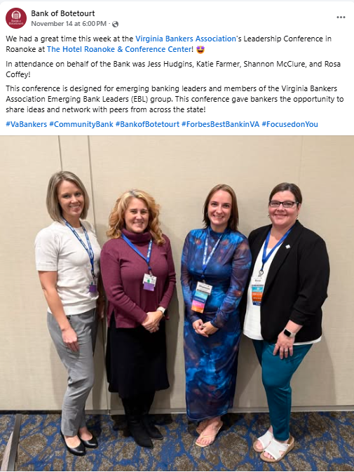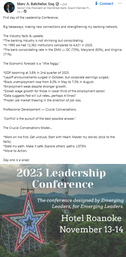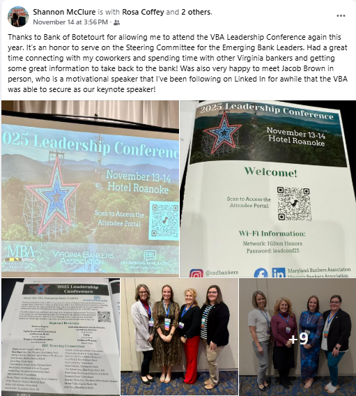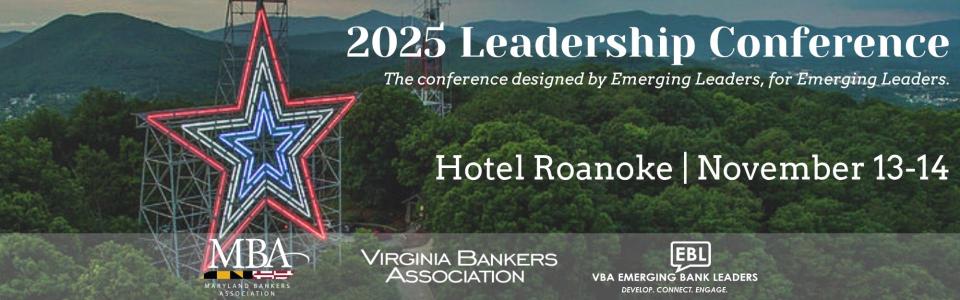 Nearly 90 bankers and industry partners joined us in Roanoke for the 2025 Leadership Conference on November 13-14. This annual event is designed for emerging banking leaders and gives attendees the opportunity to share ideas and network with peers from across Maryland and Virginia.