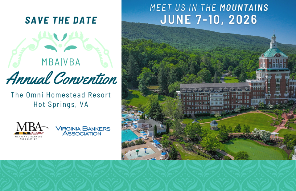 To be held on June 7-10, the 2026 MBA|VBA Annual Convention will take place at The Omni Homestead Resort in Hot Springs, VA. The 2026 event will combine a great lineup of speakers on timely topics and networking with bankers and industry providers.
