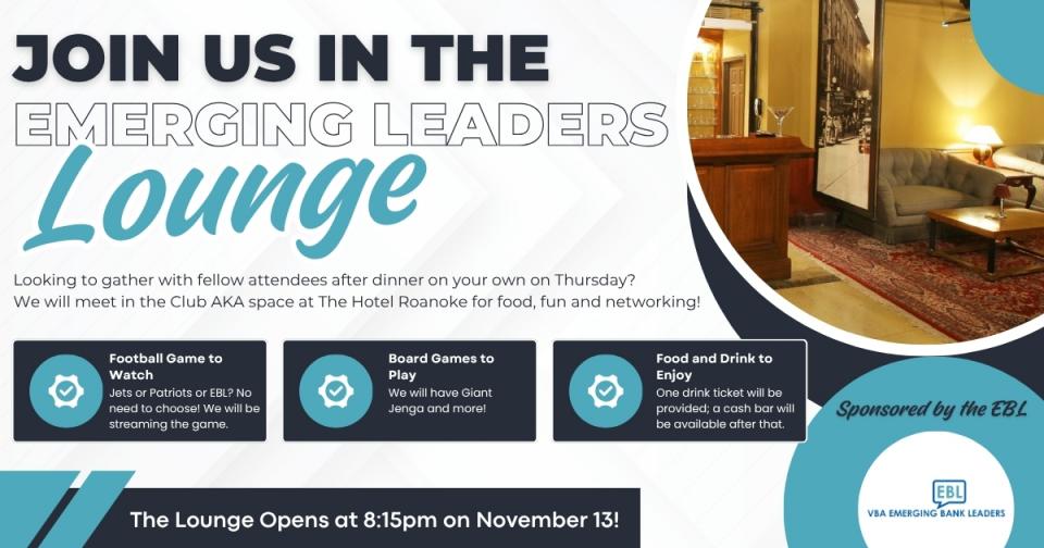 The VBA Leadership Conference is designed for emerging banking leaders and members of the Virginia Bankers Association Emerging Bank Leaders (EBL) group, giving attendees the opportunity to share ideas and network with peers from across the state. This webpage houses all of the information you need to know leading up to and during the event.