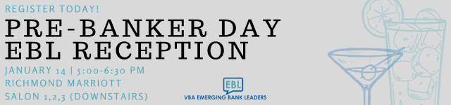 Please join members of the VBA Emerging Bank Leaders (EBL) for a Pre-Banker Day Reception on January 14 from 5:00-6:30 p.m. in the Salon 1,2,3 rooms downstairs at the Richmond Marriott Downtown.