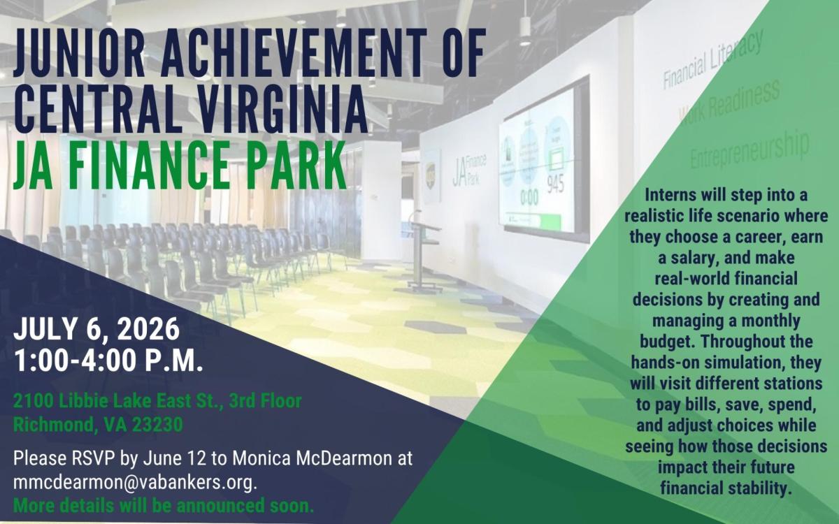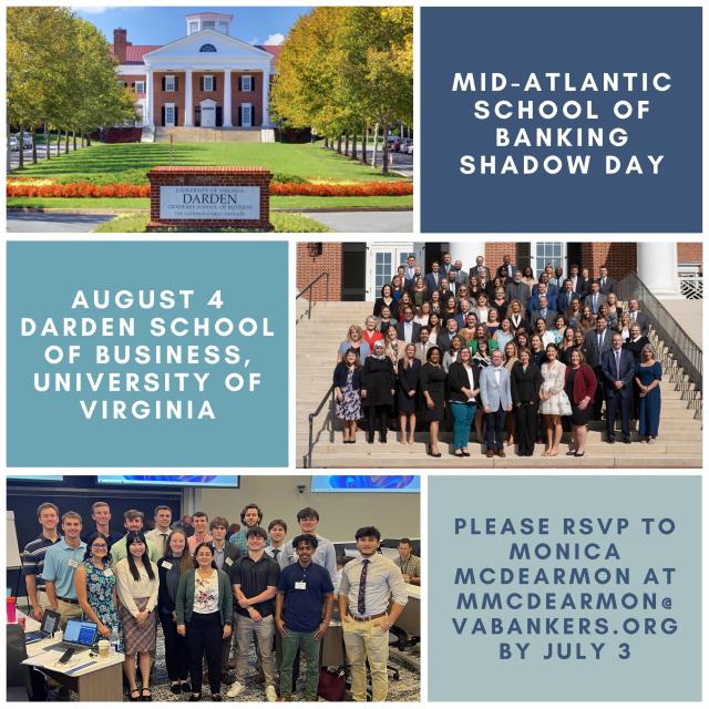 The 2026 session of the Mid-Atlantic School of Banking (Bank School) will be held at UVA in Charlottesville the week of August 2-7. On Tuesday, August 4, interns will have the opportunity to visit in person and shadow classes. A full schedule for the Bank School Shadow Day will be announced soon.