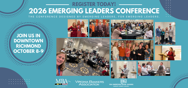 This conference is designed for emerging banking leaders and members of the Virginia Bankers Association Emerging Bank Leaders (EBL) group. This conference will give Emerging Bank Leaders the opportunity to share ideas and network with peers from across the state. You do not have to be an EBL member to attend.