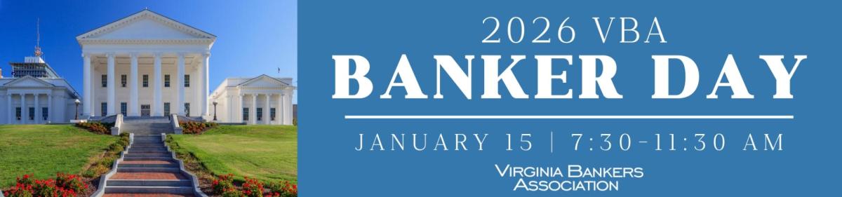 The annual VBA/ABA Washington Summit brings together bankers from Virginia and across the country for an opportunity to be the first to hear perspectives from key policymakers, updates on financial inclusion and other industry hot topics, and the policy outlook and priorities for Congress from ABA’s experts. Learn more about this free event here.